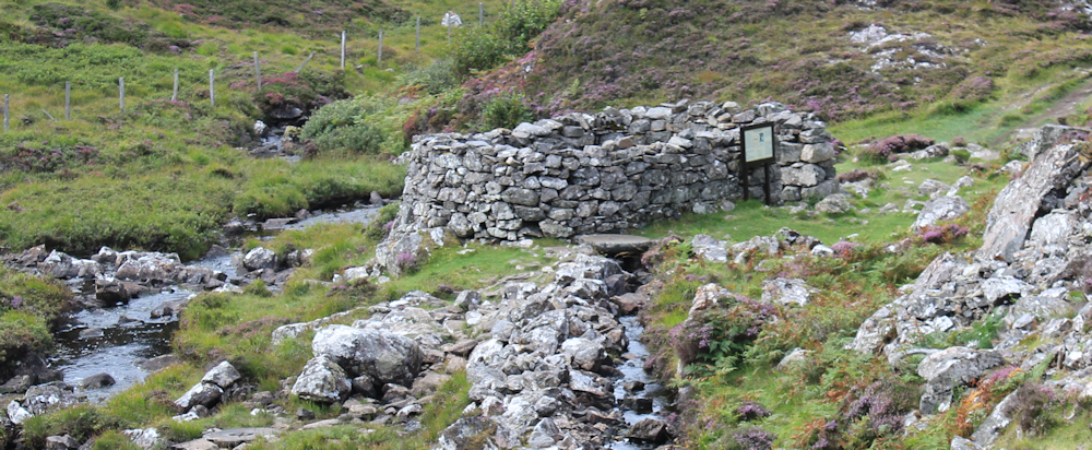 Along the valley, and I see a ruined building below me. With its circular shape, I reckon it is the remains of a sheepfold. Probably all that is left of another abandoned village after the Highland clearances, I assume, and I don’t bother climbing down to look at the sign.