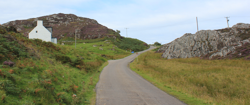A sign tells me I’m approaching Clachtoll (or Clach Toll). I pass the driveway to a small farm and begin to climb the twisting road up the next hill.
