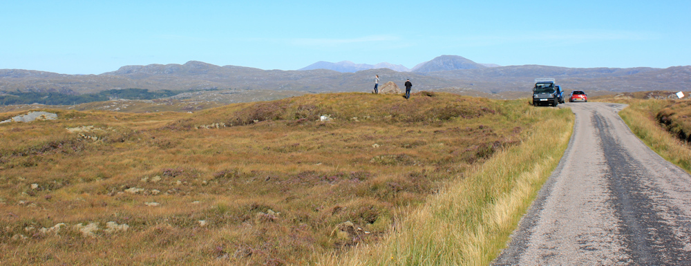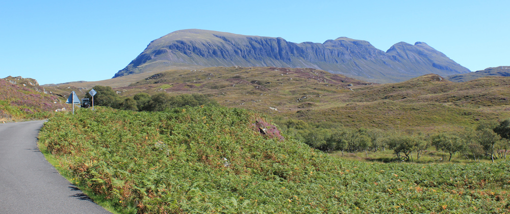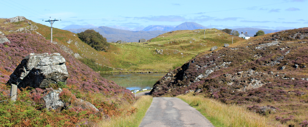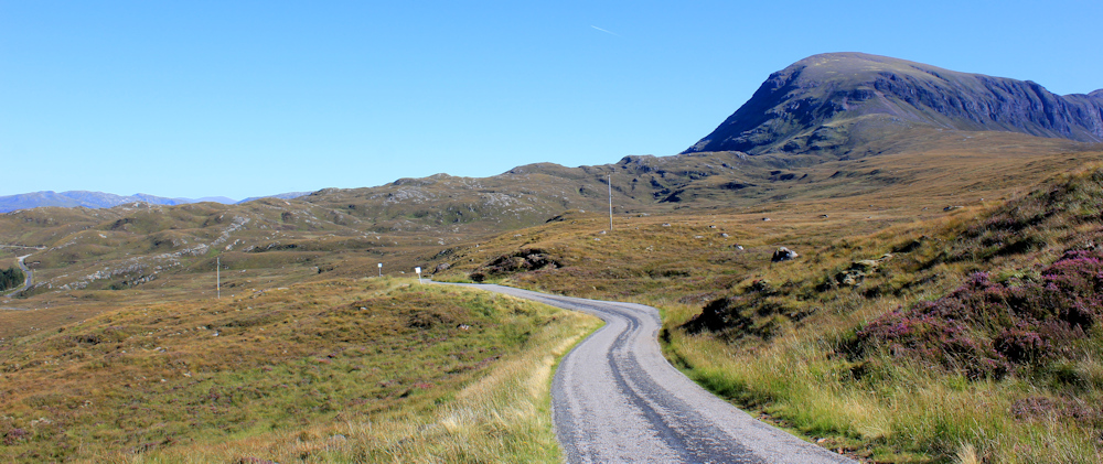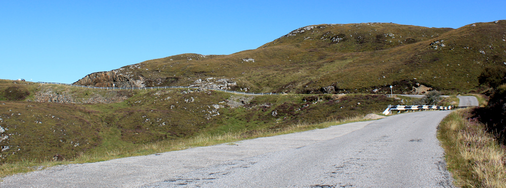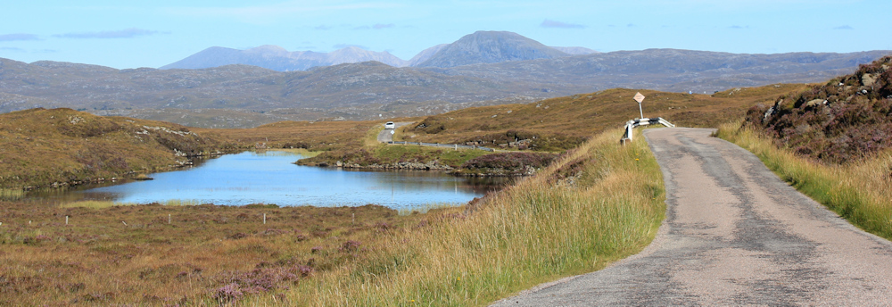 Over the cattle grid, and over the brow of the hill, and the view opens up again. Look at that wonderful moutain range! It’s the same set of peaks that I admired yesterday on my way to Drumbeg. Looks like I will be passing close to the northern flanks of the range.