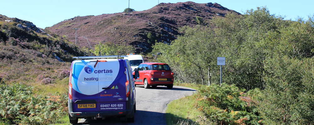 Beyond the water, and climbing the hill on the other side, I come across a mini traffic jam. Pity the poor red car that has to reverse to find the passing space and let the van past.
