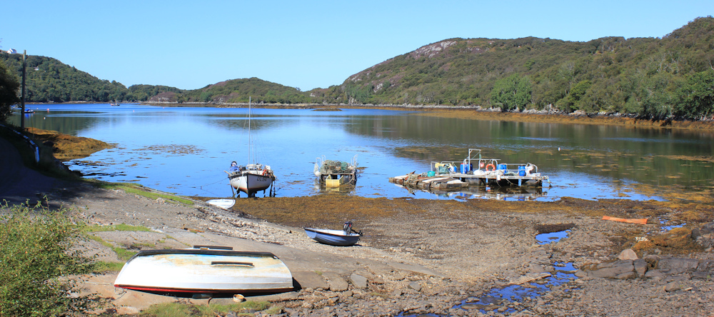 Round a bend, and a stretch of water opens up before me. This is actually a sea loch, so technically I’m walking by the coast again. Loch Nedd. At the top of the loch is an untidy collection of fishing equipment and a few small boats pulled up on the shore.