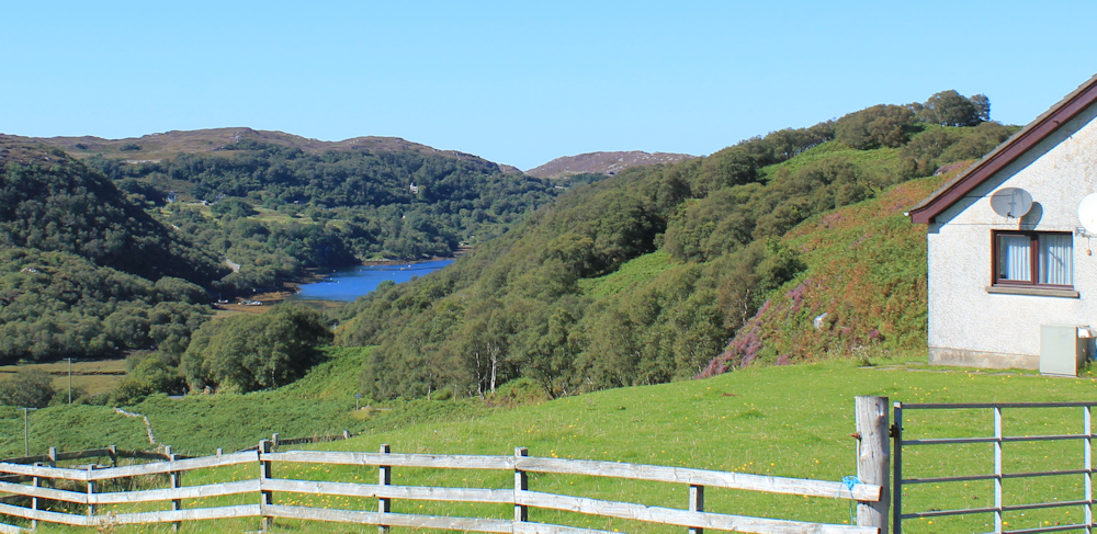 On the other side of the bridge is another hill to climb. Up I go. Reach a cottage perched on the hillside, and stop to catch my breath and admire the views. There’s Loch Nedd, again, below me.