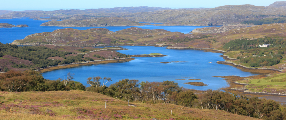 When I get nearer, I realise why. It’s a fantastic viewpoint over the loch below and the sea beyond. The couple on the raised knoll are setting up a camera, so I don’t disturb them. But, a little further along the road, I stop to take my own photographs.