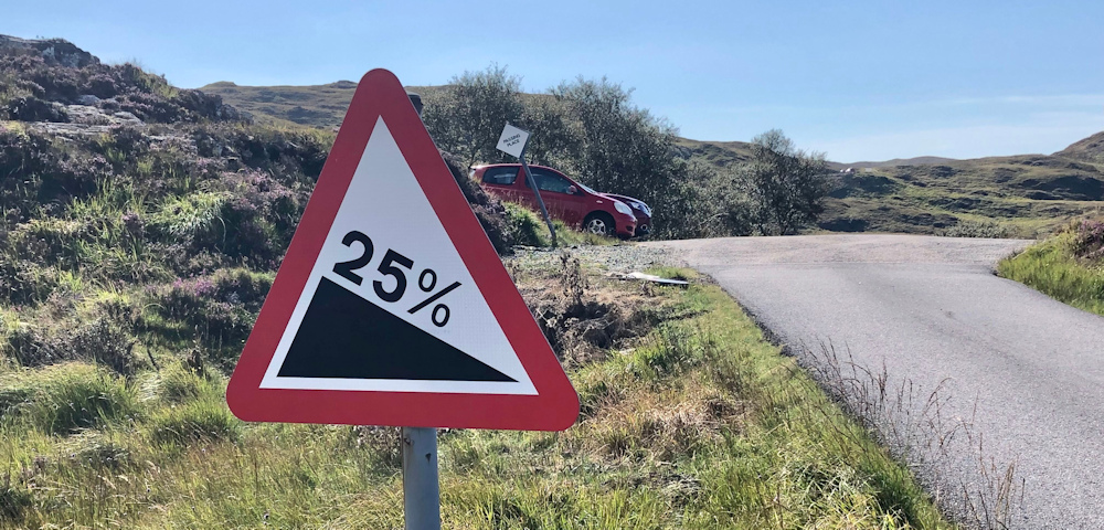 After they’ve gone, I walk along the road to see what the nearby sign is warning about. Oh, the hill I’ve just climbed has a gradiant of 25%. One in four!! I think that’s the steepest road I’ve ever climbed and no wonder I found it tiring.