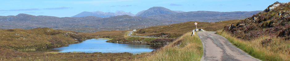 Over the cattle grid, and over the brow of the hill, and the view opens up again. Look at that wonderful moutain range! It’s the same set of peaks that I admired yesterday on my way to Drumbeg. Looks like I will be passing close to the northern flanks of the range.