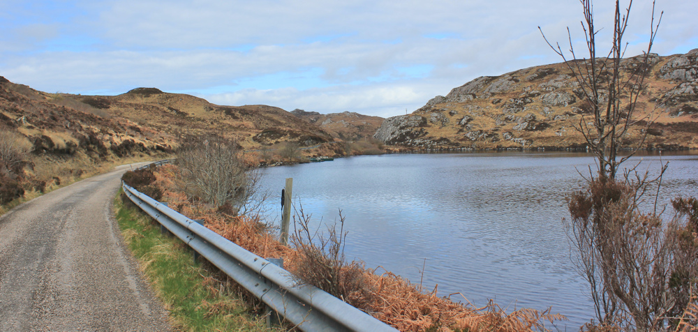 At the end of the nameless loch, the road climbs steadily, following another stream, until it opens out into another loch. This one is much larger and complex, with multiple parts and some islands. It even has a name – Loch Druim na Coille.
