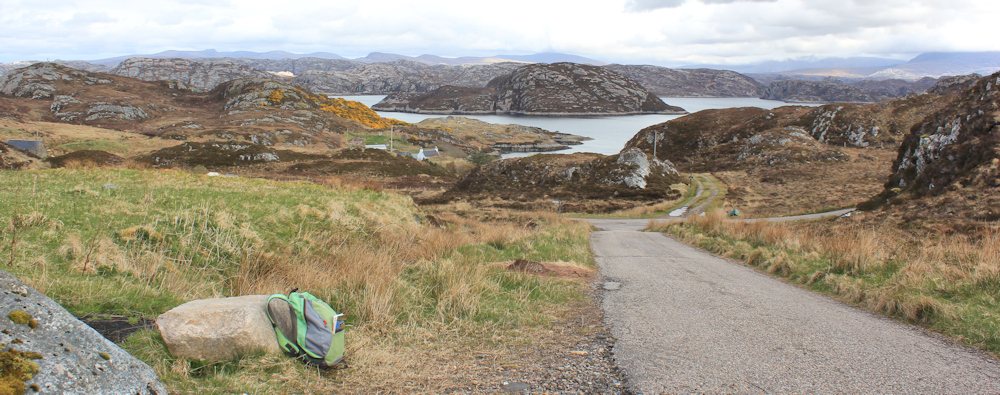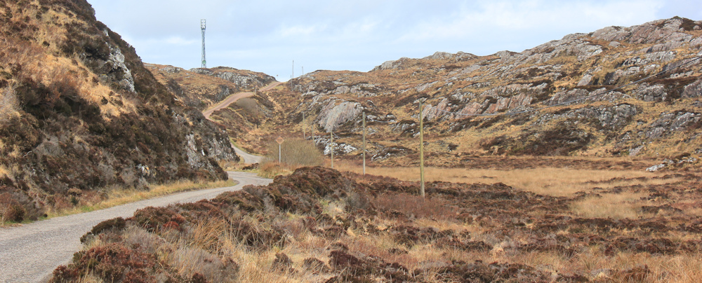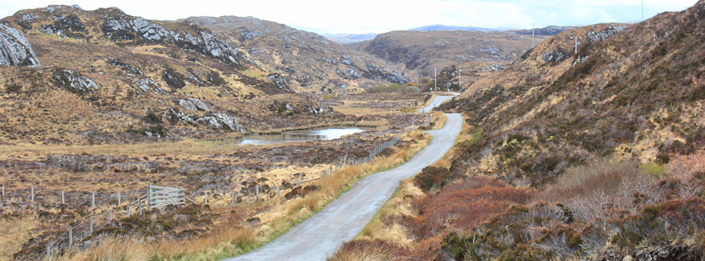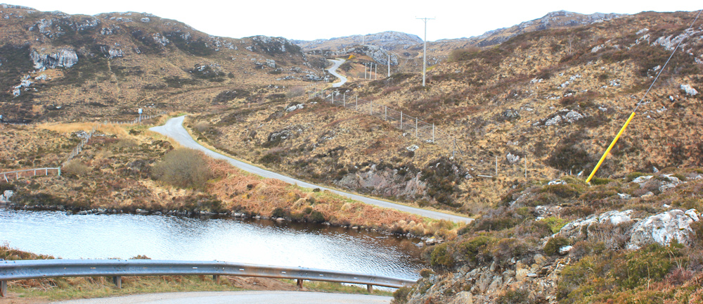 I don’t meet anybody – neither in a vehicle, nor on foot – and stop at the top of the rise at the far end of the loch. I’m entering Fanagmore. Not much here, just a few houses below – and a fantastic view over lochs and hills, and mountains beyond.