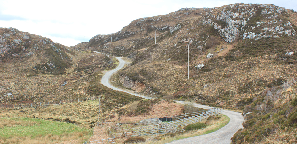 Setting off again, my little road ends at a T junction. I don’t turn left to go down into Fanagmore, deciding there wouldn’t be much to see. I could carry straight on down a rough track, because the map suggests I might be able to rejoin the main road a little further along. But I decide to stick to the road instead and turn right.