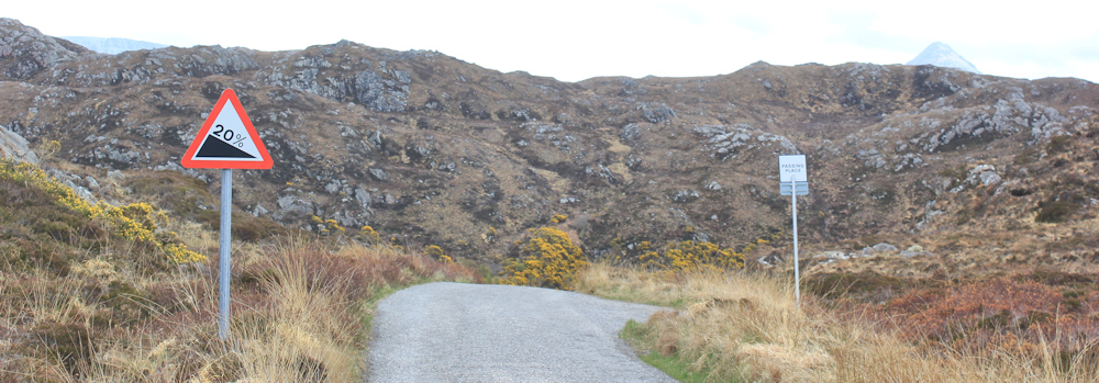 A huge motorhome lumbers past me, and climbs the road slowly, with a roaring engine and much thrashing of gears. I don’t manage to catch a photo of it. The road on this side is even steeper than the road on the other side of the loch. A 20% incline.