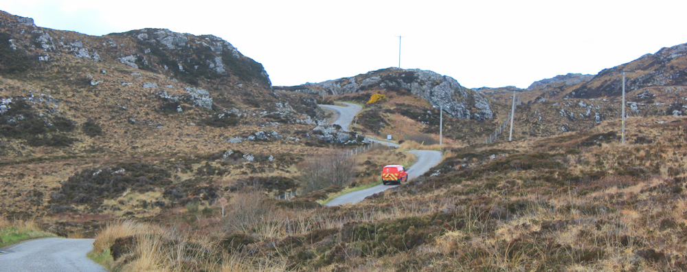 I descend and start climbing again, and am overtaken by the same red Post Office van. It’s been to Foindle, or possibly Fanagmore, and is now returning.