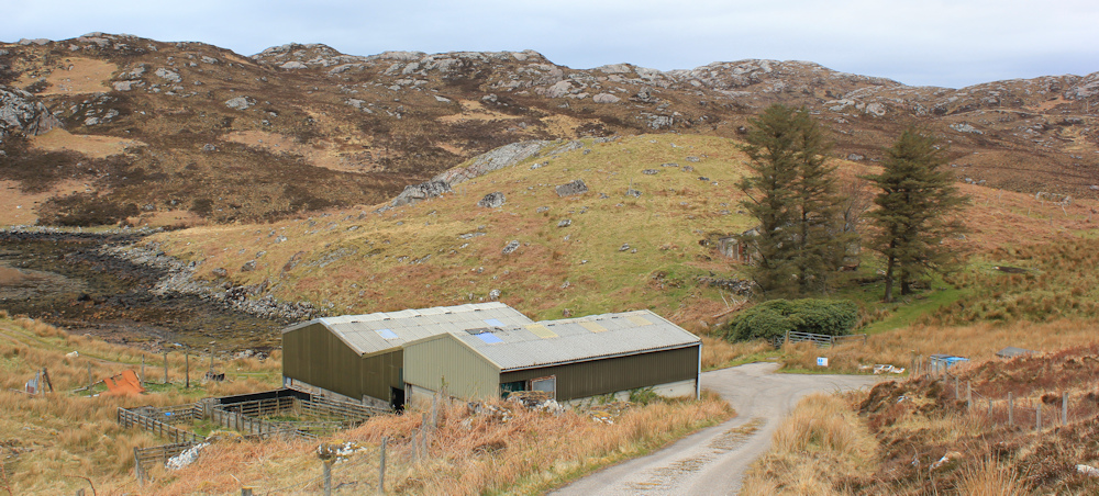 The car park is for “Ridgeway Adventure” and a sign warns you not to take your vehicle any further. I carry on down the road, keen to see more of Skerricha. Ah, this seems to be all there is. Two barn-like structures which might be storage sheds or might be accommodation blocks for the school. Hard to tell.