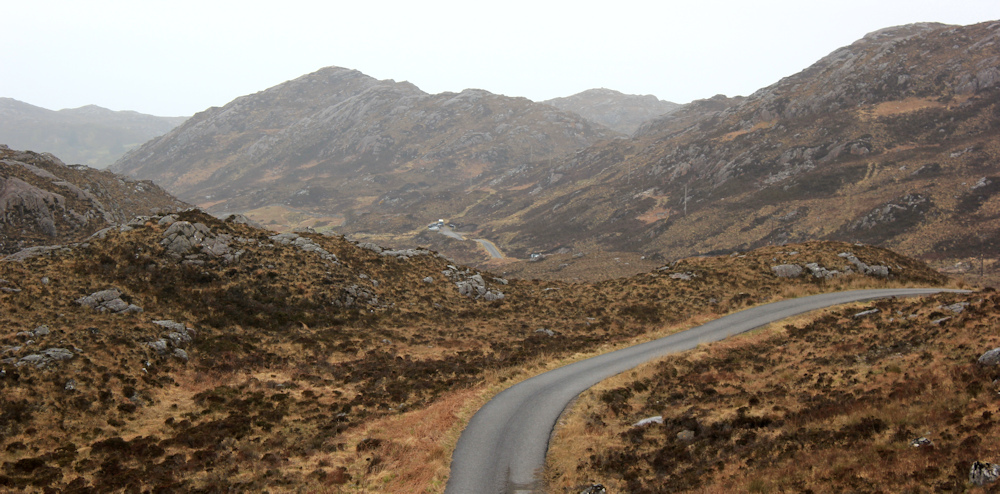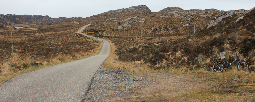 Up and down. It’s a switchback sort of road. Nobody on it. I set off, pass another little loch, and climb the hill on the other side, before dropping down again.