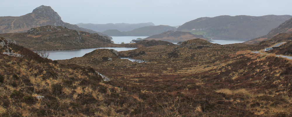 Look at that view! Loch a’Chadh – fi, which empties into Loch Laxford. The photos really don’t do the view justice, because the hills and the lochs are obscured in the misty rain. I think the green sward with a few building on it is, in fact, Ardmore. It looks like it’s raining even harder over there. Oh dear.