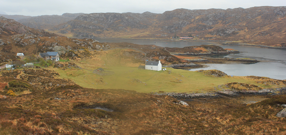 At the top of the hill, I stop to take photographs of the two houses below me, and Skerricha across the loch. (Yes, it’s still raining and the splodge in the middle of the photos is a raindrop!)