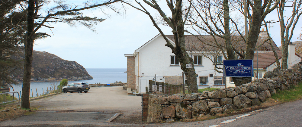 After my very unhealthy lunch of teacake with jam, I walk back up the hill to the turn off to Oldshoremore, where there is another hill to climb. Near the top I pass the Kinlochbervie Hotel. Great views!