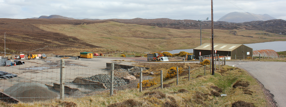 On my right is another one of those storage yards with piles of gravel and pieces of machinery. This one has a very faded sign, “Serving Sutherland, Kinlochbervie Depot”. I stop at the top of the rise, and take a photograph looking back down the road and over the depot. There is snow on the upper slopes of the mountains in the distance.
