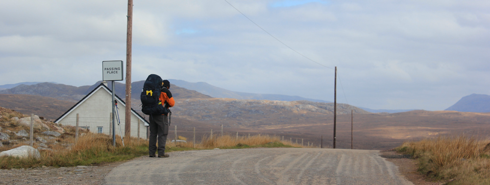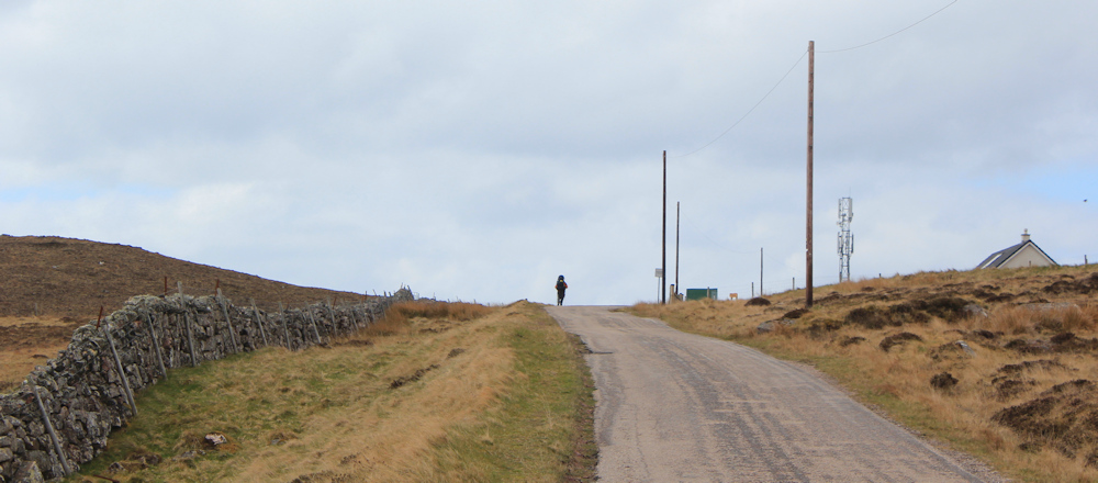 There is a walker ahead of me. The first real hiker I’ve seen on my trip so far. He is carrying an enormous back pack and, for a brief moment, I envy his professionalism. Perhaps he is completing the last legs of the Cape Wrath Trail? A proper walker, not a road-stroller like me!