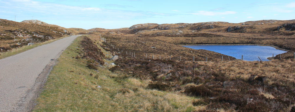 It’s a bit of a boring road, as it veers away from the coast and the landscape is treeless and relatively featureless. Traffic is light, but a nuisance, with big vans and motorhomes roaring past and not enough room to pass me safely – so I have to keep jumping off the road. At least there are some pretty lochs to look at. This one has no name.