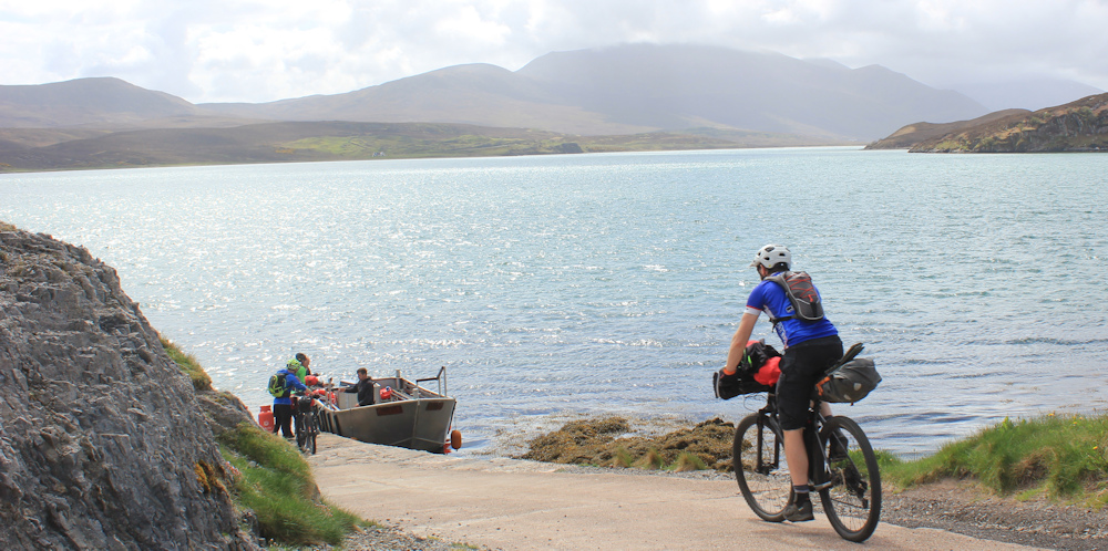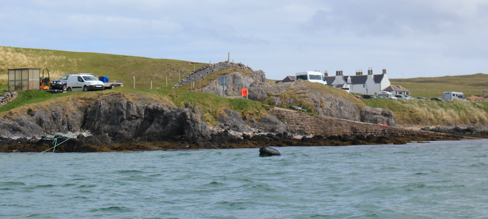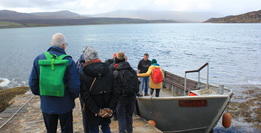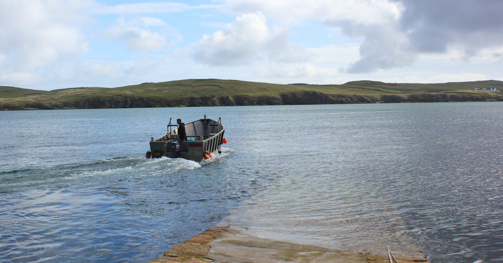Back at the ferry slip, we wait for the ferry man to arrive. He brings over another load of passengers for the minibus trip to Cape Wrath, and then we climb on board for the crossing back.