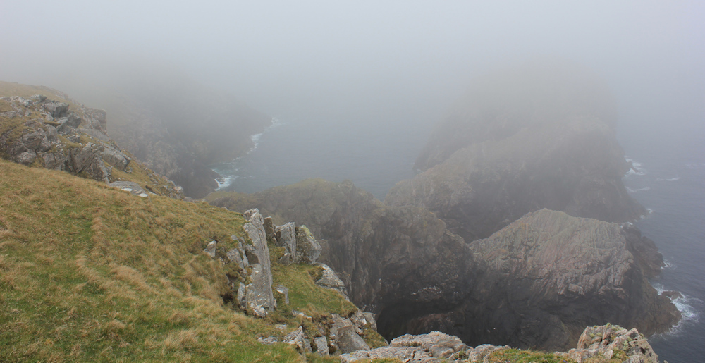 I look southwards down the coast line – wild and rugged – to where I should be able to see the beautiful beaches of Sandwood Bay. But I can’t see more than a few hundred feet. What a shame!