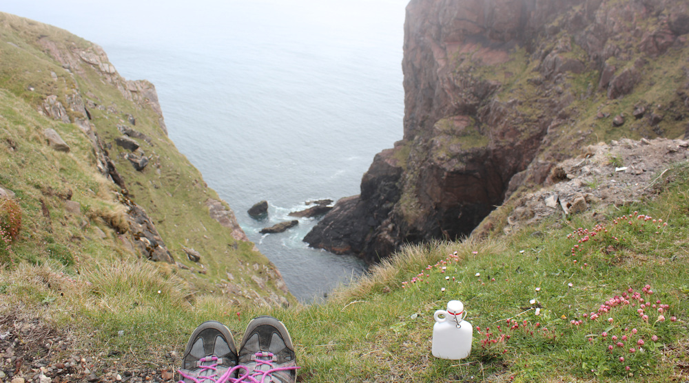 It’s nearly 12 o’clock. I sit on a cliff overlooking a small inlet, and eat my snack lunch. I’ve been carrying a small flask of whisky with which to celebrate my arrival at Cape Wrath. I take a few swigs, but I feel deflated and it doesn’t feel like much of a celebration.