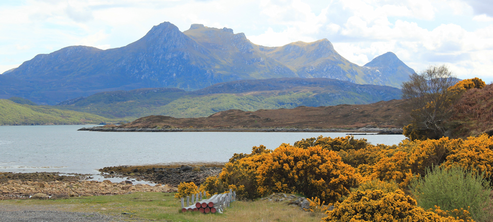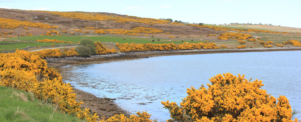 Past the cemetery, the road runs closer to the shore of the Kyle of Tongue. This is lovely. Gorse in flower – smells delicious.