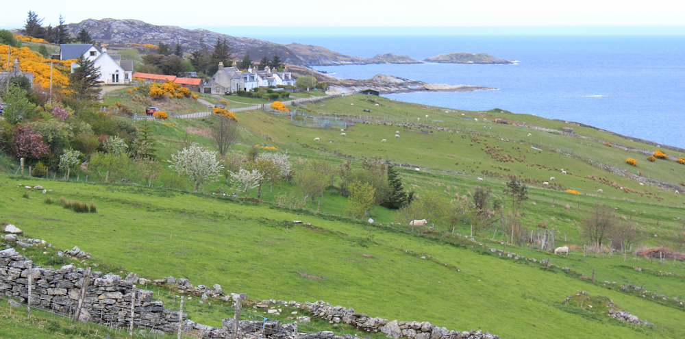 This photo is taken overlooking a low-lying headland called Ard Skinnid, according to my map. The islands beyond are called Rabbit Islands, and appear to be reachable by a sand bank when the tide is out.
