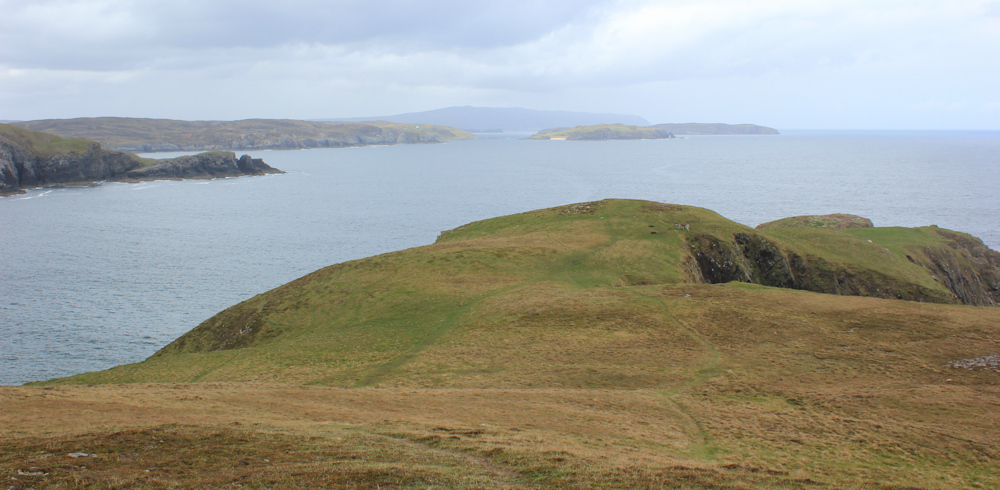 From here the path dwindles and becomes little more than a sheep trail. The point of the headland is called Sgeir Dubh (which means Black Reef in Gaelic). I don’t go right to the end, but near enough to appreciate the wonderful views. Shame the weather is a little too murky for good photography.