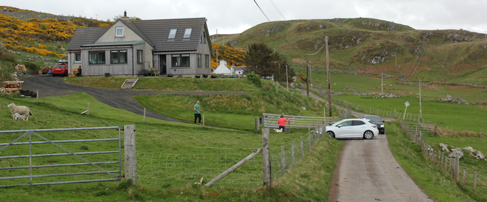 The road climbs uphill towards the place called Farr, and provides a great view back to Bettyhill. Even the unpleasant-looking campsite appears scenic from this distance. Yes, there really are two boats parked among the sheep.