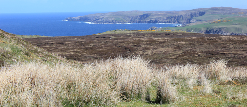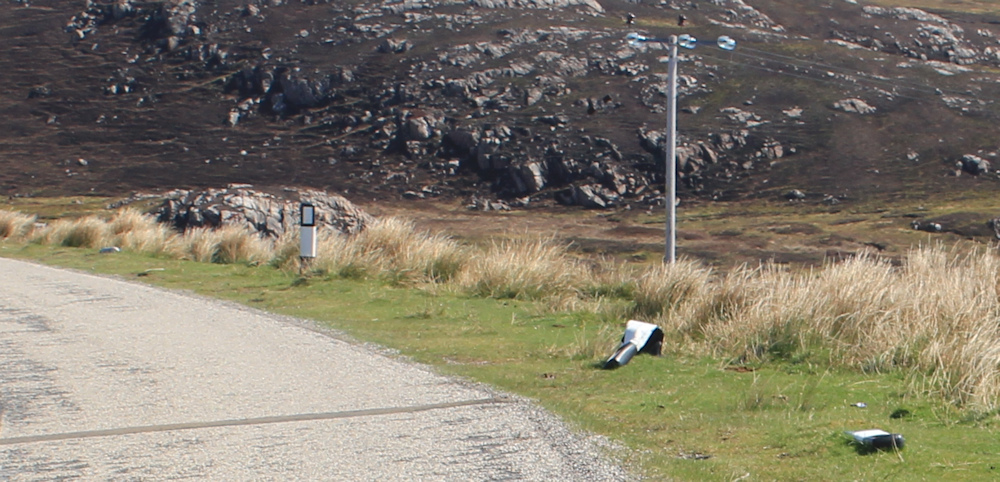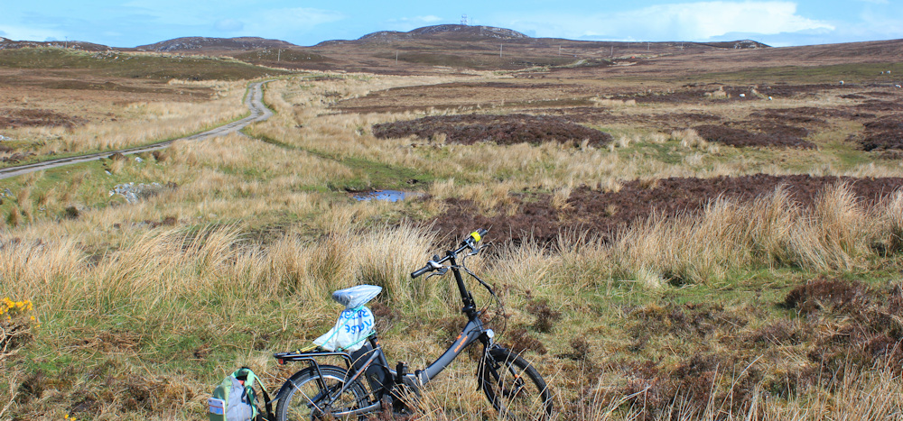 I park my Scooty bike beside the turn-off to the Cnoc Mor relay station above Kirtomy. Can see the large mast on the hill in the distance, where I stopped to enjoy the views yesterday.