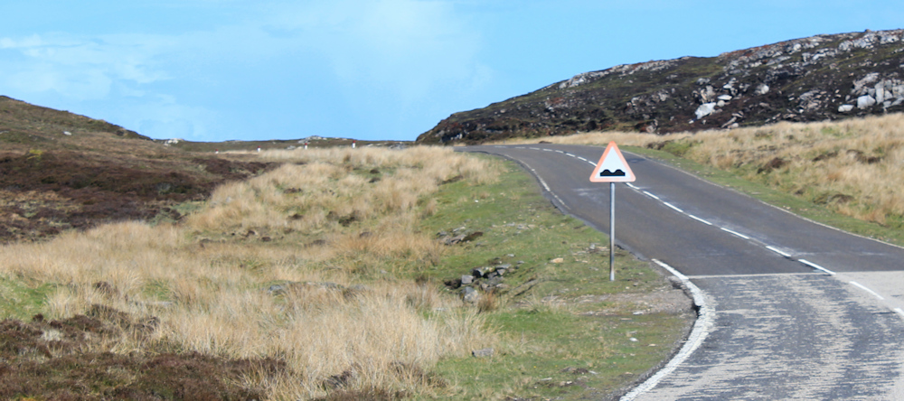 You will gather I’m not in a good mood. It doesn’t help that the road is actually quite boring. Not much to look at, apart from windswept bracken and grass. The only excitement is the occasionally hold-up caused by sheep ambling across the road.