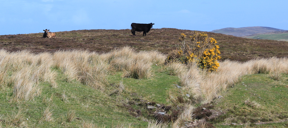 Somewhere to my left is the abandoned village of Poulouriscaig, and my map shows a track leading from there to Armadale. I did have some vague plans about walking to Poulouriscaig from Cnoc Mor, keeping closer to the coast and avoiding the road altogether. But I chickened out from attempting the cross-country route. Partly because of the poor terrain, concern that the track didn’t really exist, and fear of other hazards… such as cows.