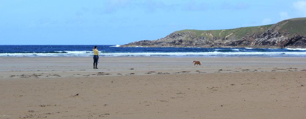 But this beach is lovely. The tide is going out, exposing acres of empty sand. Nobody here, except a lone woman who is trying to train her dog to come to heel when she calls him. She seems to be doing well.