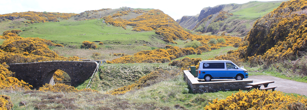 Across the road is a tiny car park where I have left my van. I think this is the remnants of an older road, because there is an old bridge across the burn, but the route is now closed to traffic.