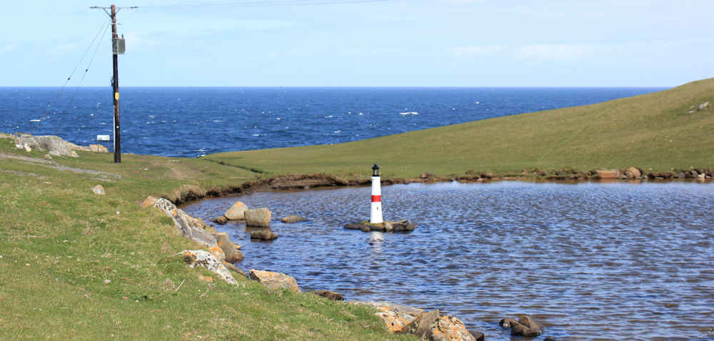 On the way to the lighthouse, I pass a little lochan – Lochan nam Faoileag – where a tall model lighthouse sits proudly on a rock.