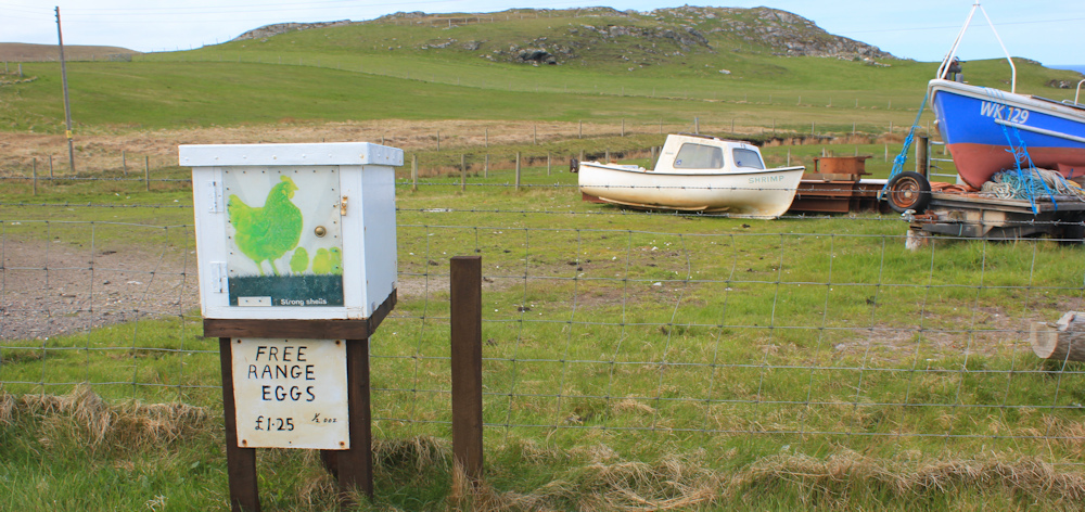 I continue walking the shore until I rejoin the road to reach the car park where I left my Scooty bike. A little box on stilts promises me free-range eggs – and there are several egg cartons inside. “Strong shells” says the sign, as if guessing why I might be reluctant to buy any eggs today.