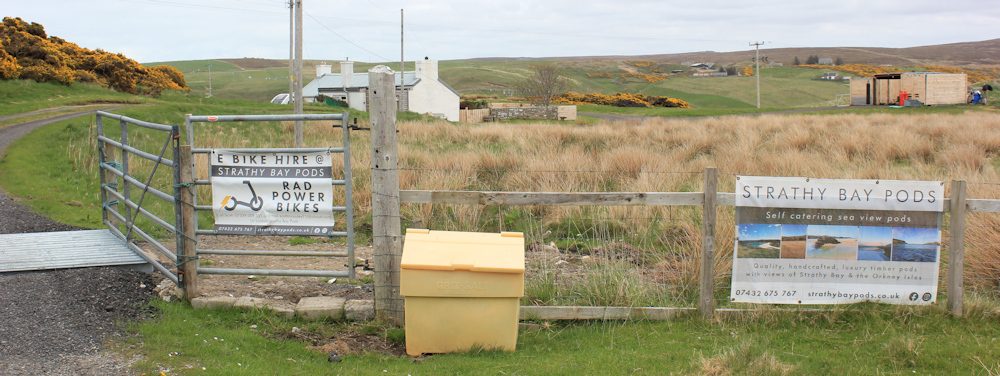 But, before I join the main road, I pass a sign for “Strathy Bay Pods” and, intiguingly, see that ebikes are for hire. I’m so grateful for my own ebike. Cycling up hills against the wind is still hard work, but it would be much harder without the little push of electric power to help me.
