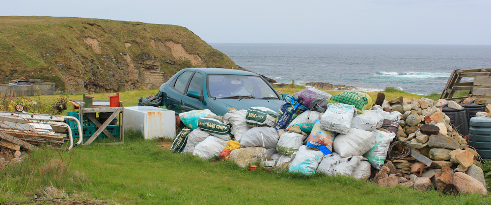 I pass one of those little dumping grounds that seem so common in the Highlands. Some sort of landscaping or building project? The usual wrecked car is acting as a shed.
