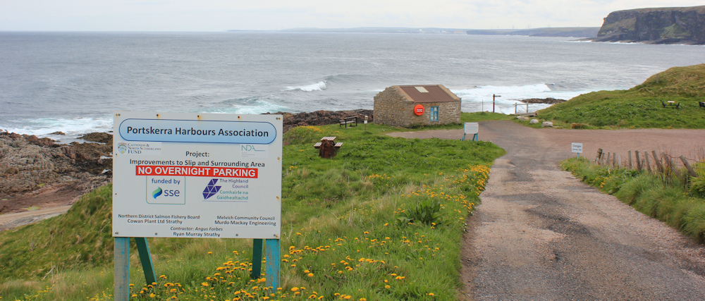 There is a little car park at the end of the track. “Portskerra Harbours Association” says the sign, and “No overnight parking”.