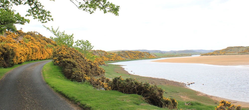 Passing the big house, I’m now on the public road, and what a delightful road it is. Fragrant gorse. A wide, lazy river. Perfect.
