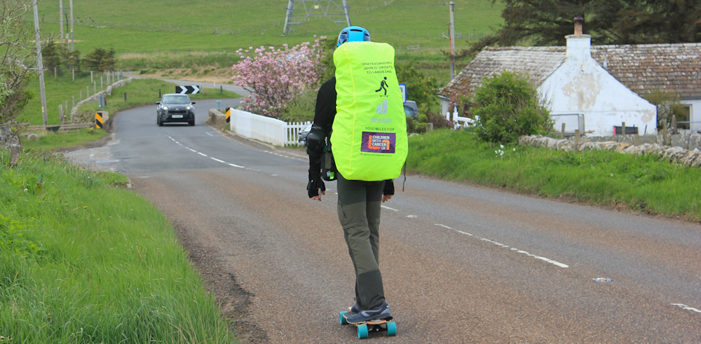 Later, as I pedalled furiously against the wind on Scooty, I came up behind the same guy, still on his skateboard. But, now I realised the yellow surfboard was in fact a gigantic yellow backpack. According to the lettering on the pack, this man is skateboarding from John o’Groats to Lands End for children with cancer.