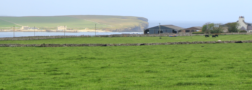 From a higher point on the road, I can look across green cattle fields to Sandside Bay and Sandside Head where I walked yesterday. It is positively glowing in the sunlight. Wish I was back there.