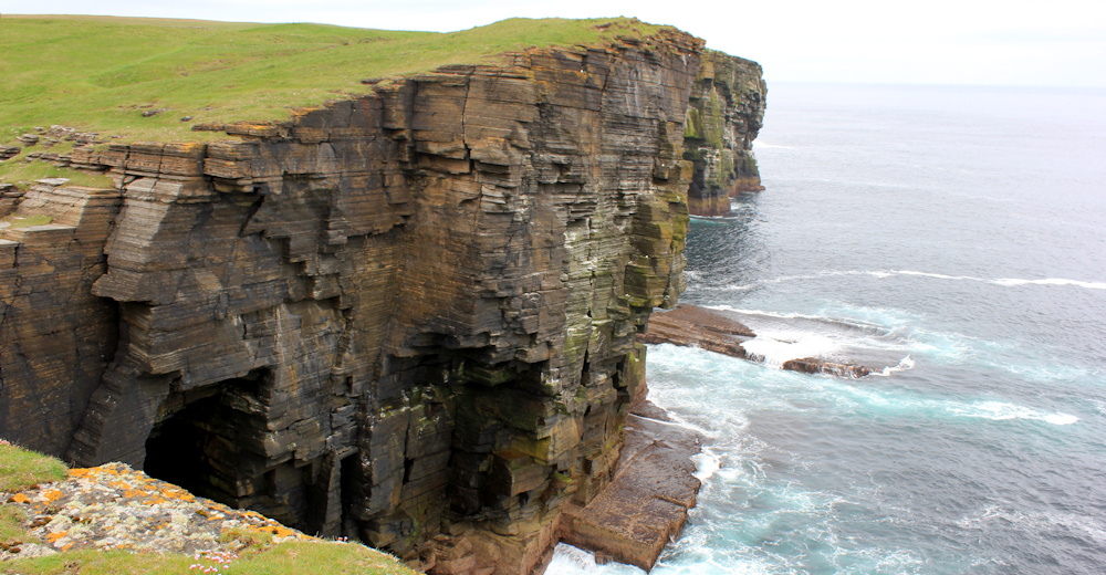 The rock formations here are terrific. Horizontal striations give the cliff a sense of unreality – it looks carved rather than natural, or formed by a giant who layered slabs, one on top of the other. Huge caves are chiselled underneath, where waves thump and foam.