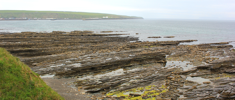 The rock formations here are quite impressive, but lie mainly longitudinally under the low cliffs. Over the bay is Scrabster and its harbour, with the stubby little lighthouse above it.