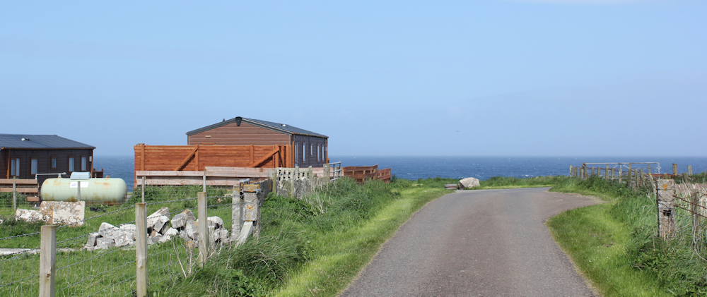 The little road takes me back to the coast, where some holiday chalets overlook the sea, and the road bends sharply round to the right.