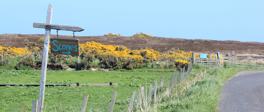 A sign beside the road promises “scones” and points towards the blue cottage. It’s nearly 2:30pm and, although I don’t feel particularly hungry, that means it is definitely the right time for tea and scones.