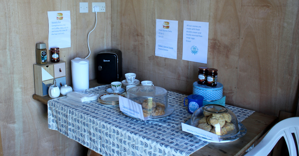 Nobody inside. At first I am confused, and then I realise it is a self-service honesty-box cafe. You make your own tea. Milk is in a tiny fridge. And there is a plate of homemade scones and a choice of jams. £5 for tea and two scones – what a bargain!