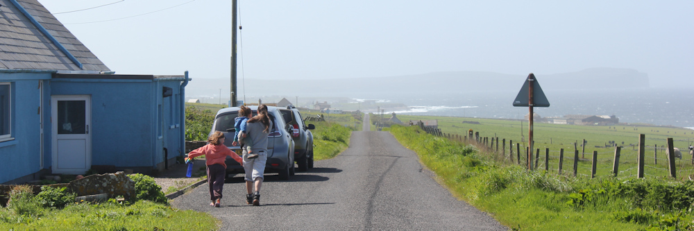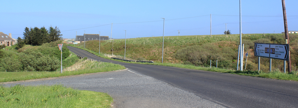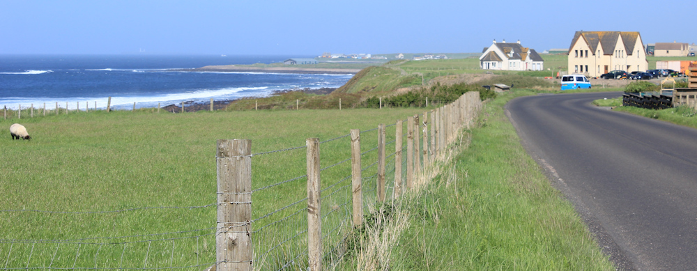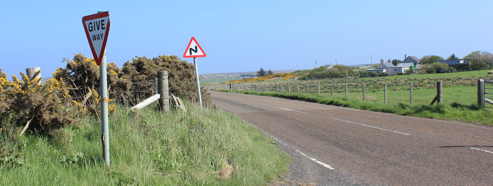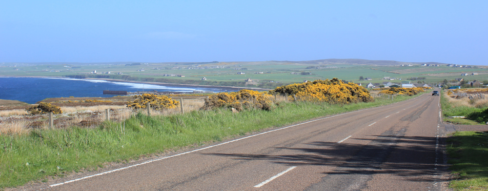 This section of road runs parallel to the coast. It’s the back road through a scattered community that seems to be called East Mey. The road runs long and straight.