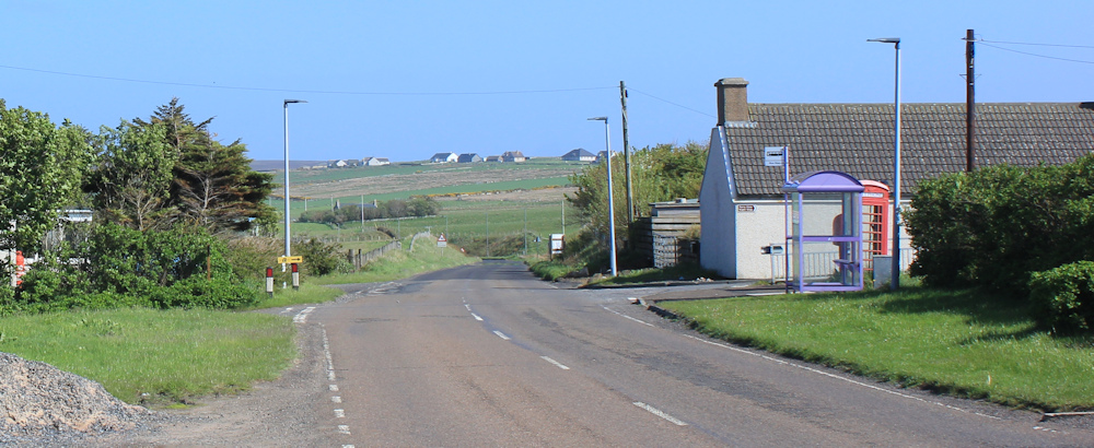 I approaching the settlement called Gills. This must pass for the centre of the village – a bus stop and a telephone box!
