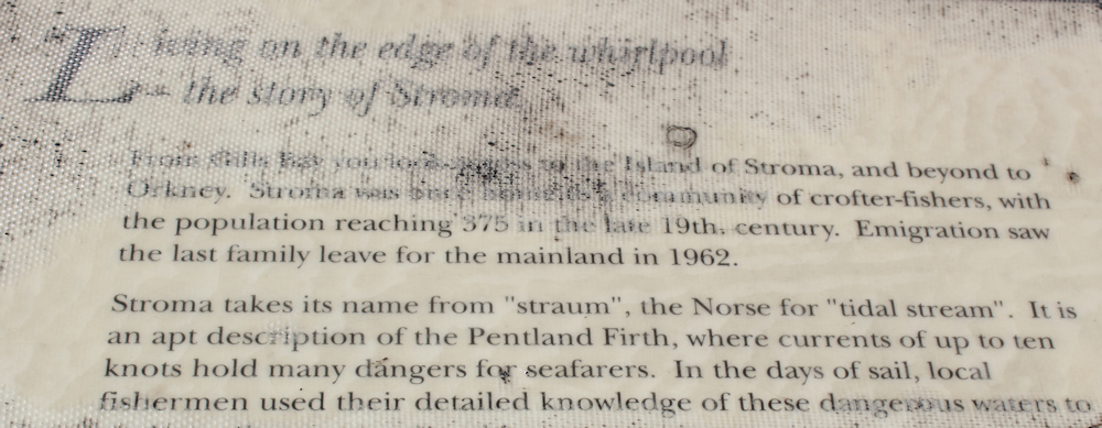 Nearby, there is an information plaque, telling me all about the Island of Stroma. It is separated from the mainland by the notorious Pentland Firth.